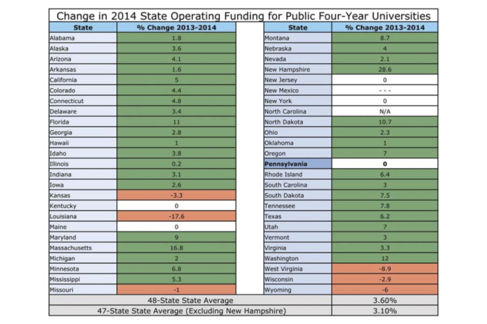 Meanwhile, Pennsylvania State funding for the State System was cut 18 percent in 2011-12, from $444.5 million to $412.8 million, and that appropriation has remained stagnant ever since.