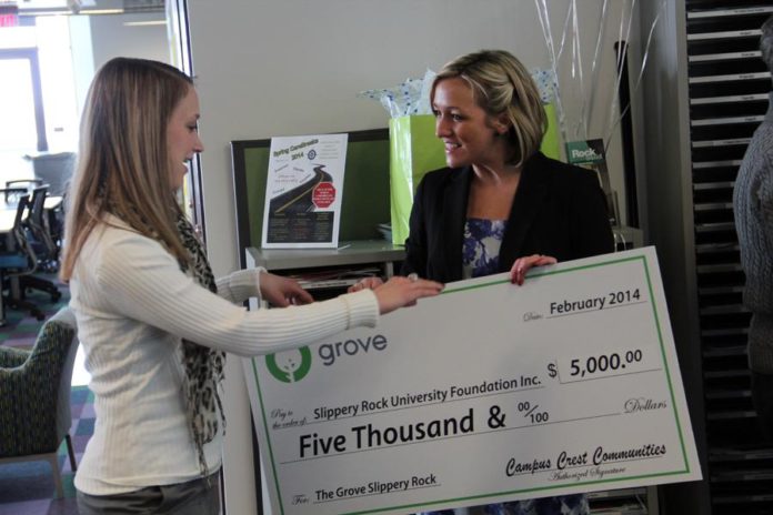 The Slippery Rock University Foundation received a $5,000 donation from Slippery Rock’s newest apartment complex, the Grove, Monday morning. The money is being utilized by the Center for Student Involvement and Leadership (CSIL) to expand on volunteer opportunities and events for students.