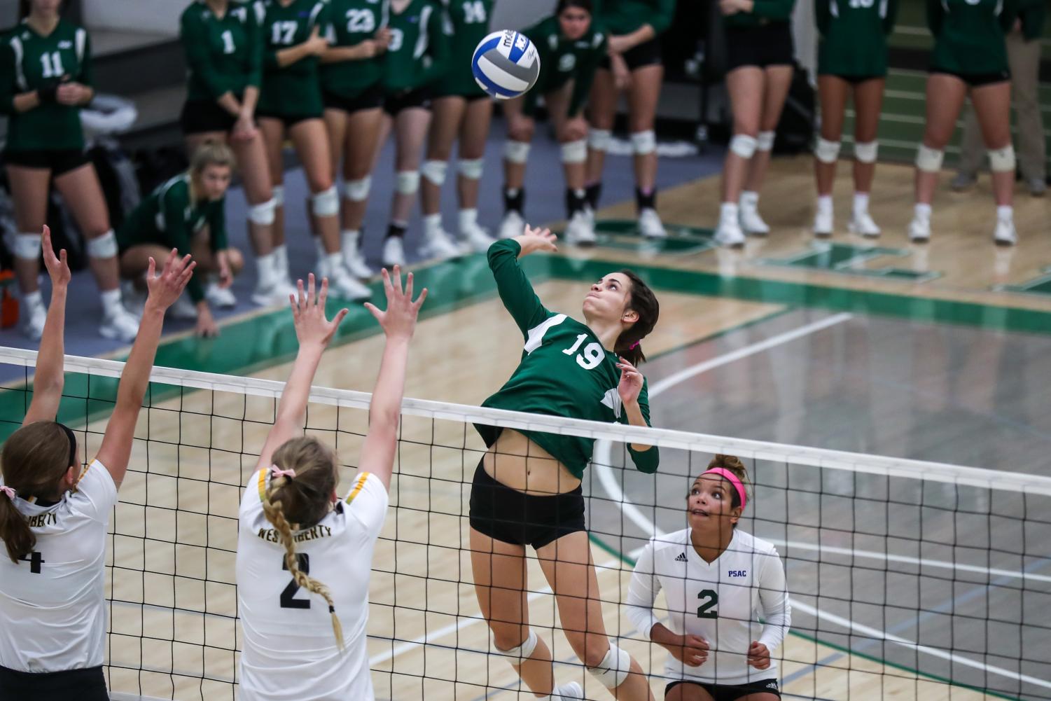 It was the same story in the second set, as the Green and White would open another early 10-6 lead. West Liberty briefly tested The Rock scoring the next four of five points cutting down Slippery Rock’s lead to a slim 11-10 advantage. After a timeout, SRU suffocated West Liberty’s attack and shelled their defense as well. Slippery Rock would score the next nine points, busting the set wide open. The Hill toppers could not recover from the SRU run, as The Rock would also take the second set by a score of 25-19.