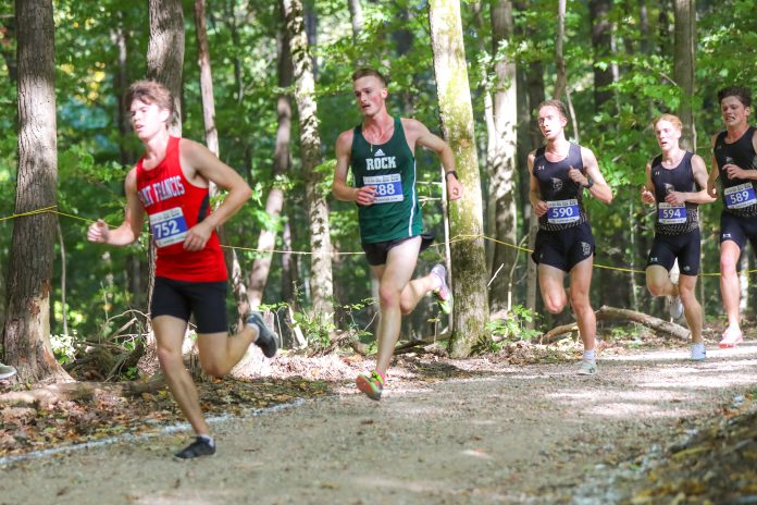 Sophomore Eli Schreiber runs in the Allegheny Cross Country Classic. He led the charge for The Rock with a 13th-place finish. Photo courtesy of SRU Athletic Communication.