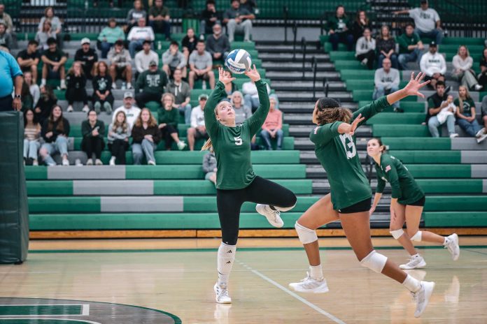 Saturday’s contest against Pitt-Johnstown got off to a solid start, with the Rock leading 3-0 in set one behind kills from Rumbaugh and sophomore Gwen McCarthy. Despite this, the Mountain Cats would quickly respond, winning nine of the next ten points.