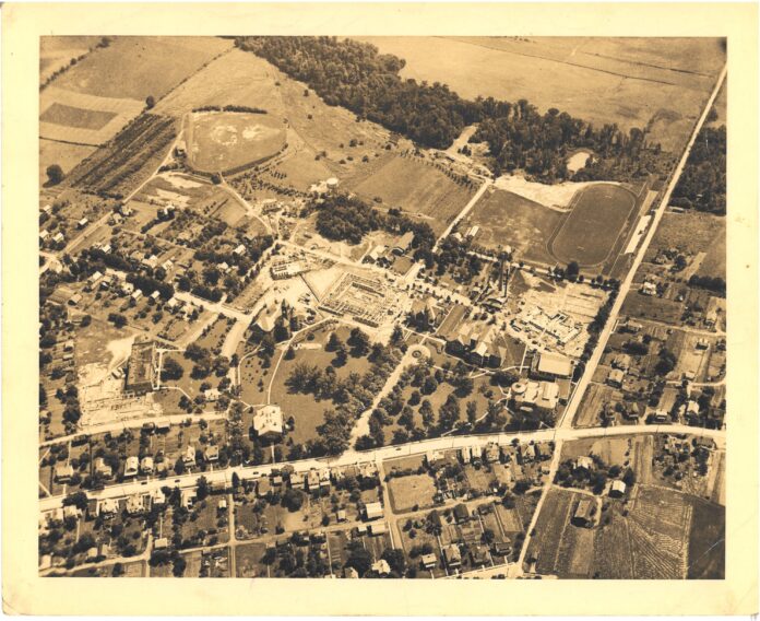 In an aerial photograph from approximately 1939, an acid drainage pond can be seen in what is now the quad. There were no buildings in that area at the time.