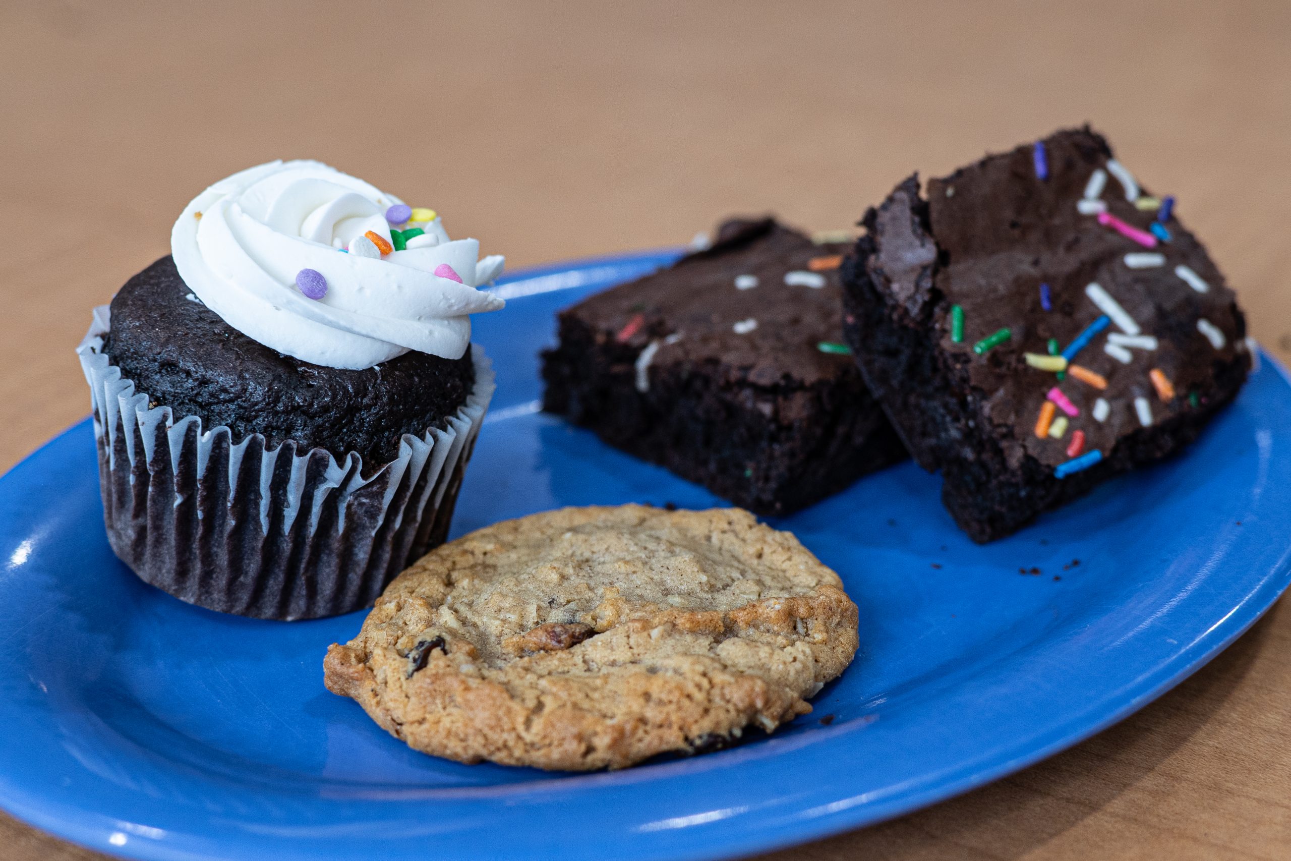 A plate full of brownies, a cookie and a cupcake sits on a table at Boozel. Boozel diversified its ice cream flavors this semester, adding peach, mint and more. Katie Domaracki/The Rocket